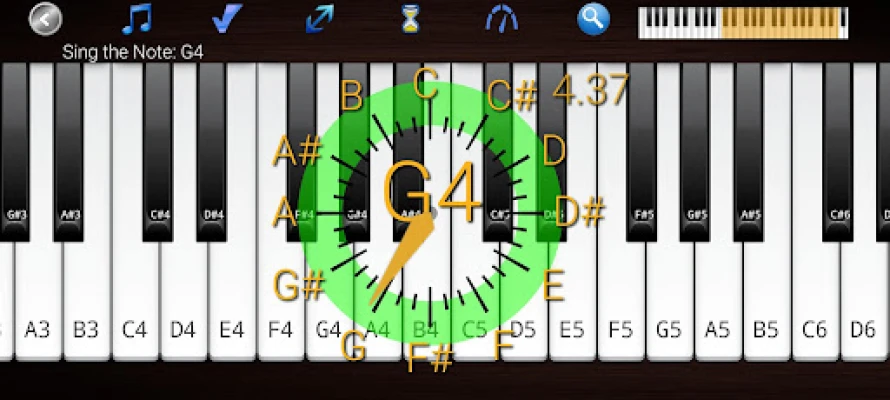 • The piano keys highlight showing which note you should sing and which pitch you are correctly singing.