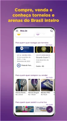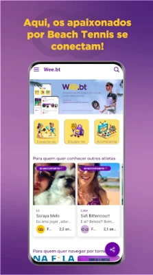 A Wee BT conecta você ao mundo do Beach Tennis. Encontre as melhores arenas, descubra os próximos campeonatos, compre e venda artigos de BT, assista as transmissões de jogos, encontre sua dupla e muito mais. A sua evolução do Beach Tennis está aqui, afinal, ninguém chega ao pódio sozinho.
