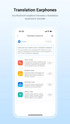 Connect your own bluetooth earphone to the phone via bluetooth, open the WOOASK APP translation earphone interface, and it can become a translation earphone in one second. When translating, each person wears a earbud, which makes the translation operation more convenient and the communication more natural, which greatly improves the user's translation experience.