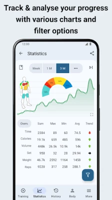 • In-Depth Analytics: Analyze your progress with detailed statistics, charts, and reports (e.g., 1RM, training volume, calories, rest times).