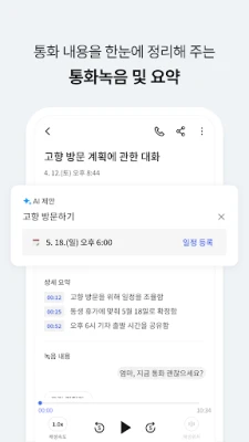 AI가 추천하는 대화 주제를 볼 수 있고 통화 직후 방금 한 통화 내용을 요약하고 통화에서 언급된 할일과 일정을 카드 형태로 모아서 알려줍니다.
