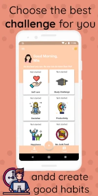 Starting a healthy lifestyle, taking a break away from the internet, practicing gratitude, learning a new language, trying to be more productive, finding happiness, self-help, how to study effectively, ways to spread kindness and positivity, tips for fixing your sleeping schedule, self-care practices, decluttering, being more confident, writing journal prompts and daily positive affirmations are some of the challenges that you can find in the app.
