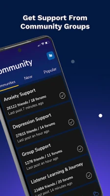 • Join community, private and closed support groups, mental health forums & chat rooms to share experiences and find encouragement.