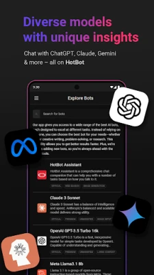 HotBot™ integrates powerful AI models such as OpenAI’s GPT-3.5 and GPT-4, Anthropic’s Claude 3, Meta’s Llama, Google’s PaLM, and many others. Experience the forefront of AI technology, all within a single app.