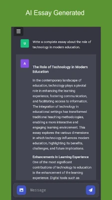 AI-Written Essays On Any Topic: With the help of the "AI Essay Writer" which is your personal AI Essay Generator, you can compose complete essays on any topic.