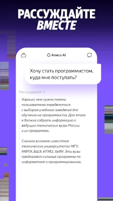 Use AI chat for professional work. The assistant helps with programming and code, offering multiple solution approaches. Alice AI teaches logic, explains logical problems clearly, and shares interesting facts. Get advice and recommendations on any topic—Alice answers in detail, suggests step-by-step actions, and helps you plan.