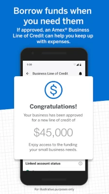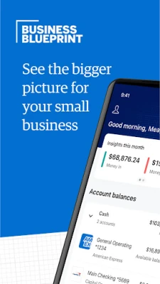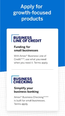 ** With the American Express Business Blueprint™ App, you can view your select business products . These products include American Express® Business Line of Credit, American Express® Business Checking, and American Express® Business Cards. Customers may also view the eligible external business checking and card accounts they choose to link to Business Blueprint. Additional terms and limitations may apply. Some app features may only be available on supported devices. Message and data rates may apply.