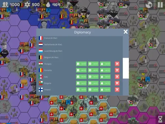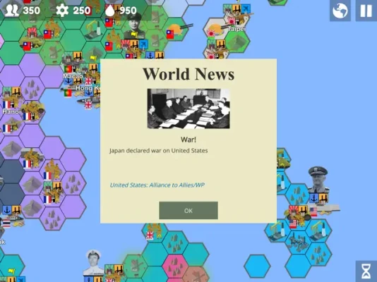 From custom events to war declarations, this recent addition allows dynamic games of multiple alliances and betrayals; custom events can also be made to reflect historical events with different types of consequences (changes to resources, alliances, unit experience). Aid can also be given to allies like Lend Lease in the real WW2.