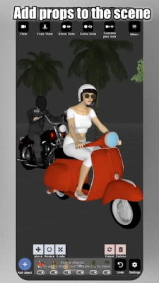 Enrich the scene with props! Add chairs, tables, weapons, vehicles, trees, and geometric shapes to the scene. You can even attach props directly to the model’s hands, and the props will follow hand movements.