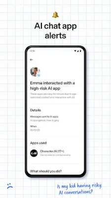 Aura’s AI-based monitoring system identifies risky chat interactions across popular apps. It flags high-risk AI chat apps, analyzes conversation sentiment, and alerts you when a conversation or app may impact your child’s safety.