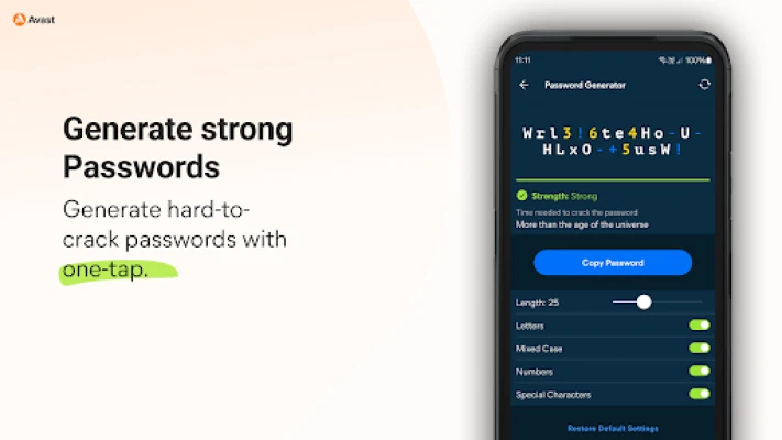 Secure your digital life from online threats with our end-to-end, zero-knowledge encryption password vault and built-in password generator that allows you to create strong and unique passwords on the go. With zero-knowledge encryption and two-factor authentication, only you can unlock and access your data, not even Avast has access to your vault. These security measures help keep your data safer from cybercriminals and hacking attempts.