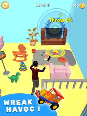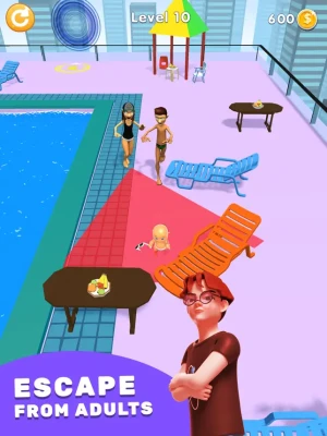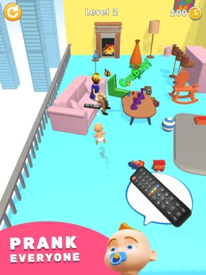 Move the baby with the joystick and avoid the parents to avoid being caught. Proceed to the target by hiding under the tables.