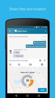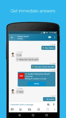 With BBM Enterprise, you only need one app to cover your mobile messaging and collaboration needs. Users know when their colleagues have received and read messages, so they can collaborate with confidence, in real-time. One-to-one chats, group discussions and file sharing all happen with the protection required by security-focused organizations – and all with an immediacy and accountability that’s hard to achieve through any other communication channel.