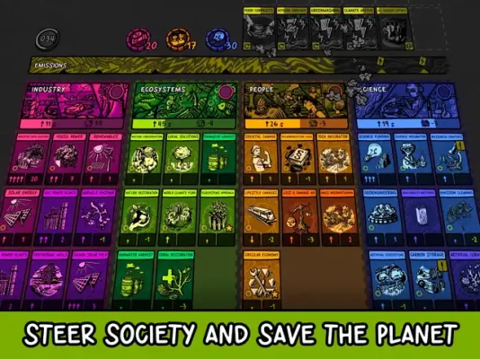 Game cards represent inventions, laws, social advancements, or industries - each designed on the basis of real-world climate science. In addition, partially randomized world events occur, forcing you to adapt your strategy. Gradually unlock new cards in the game encyclopedia and chart your path towards a new future.
