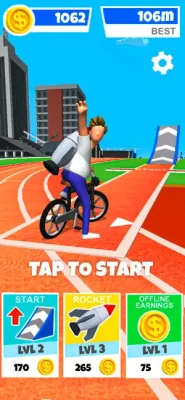 EASY CONTROLS All you need is tap right! Tap to start the crazy ride, tap one more time in front of the ramp to get the acceleration for your bicycle, and continue tapping to use the jetpack while flying.