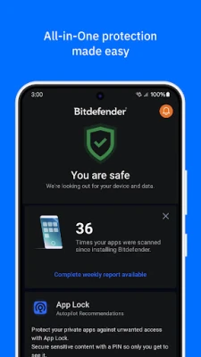 Bitdefender Mobile Security & Antivirus delivers industry-leading protection for your Android phone or tablet. It safeguards against viruses, malware, and online threats, all while keeping your personal data safe—and with minimal battery impact.