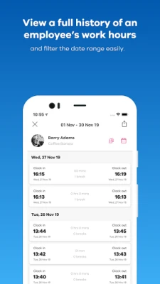 - View a full history of an employee’s work hours and filter the date range easily.