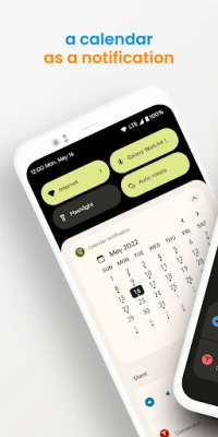 View your calendar and agenda as a notification. See you agenda and a full month of events and dates all from your notification shade. Just drag down your notifications at any time and have simple, easy and quick access to your calendar anytime.
