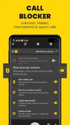 - Enable whitelist to avoid blocking your favorite contacts/numbers