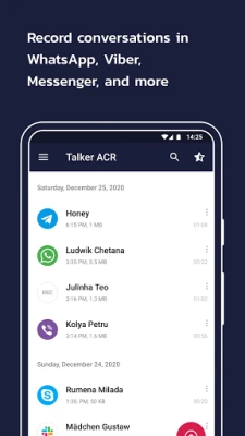 Unlike other apps of a similar kind, Talker call recorder ACR allows you to record WhatsApp calls as well as conversations on Viber, Skype, Hangouts, Facebook, and other messengers in the highest possible quality, in a matter of a few simple steps.