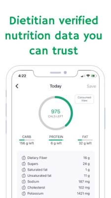 • Full nutrition macro tracker & calorie counter - Detailed daily nutrition analysis. Count calories and see full details of the foods you ate - from Calories, Carbs, Fat, Protein to Dietary Fiber, Sugars, Saturated / Unsaturated fat, Sodium, Cholesterol, and Potassium.