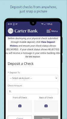 • Visit https://www.carterbank.com/resources/access/online-and-mobile-banking for more details