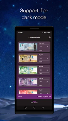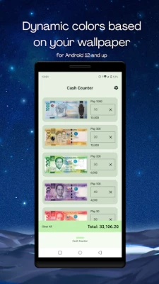 This money counter app has a simple, straightforward, user-friendly interface designed for quick input and totals. It supports dark mode. It also supports dynamic colors based on your wallpaper for Android 12 and up.