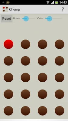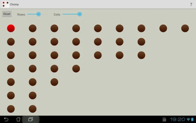 Chomp is a game of logic and strategy, played against the computer. By touching one of the pills, that one and all to the right and below it are captured. The brown ones are delicious chocolate pills, but the red one tastes bitterly. So the object of the game is to leave the red pill to your opponent.