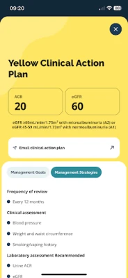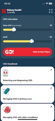 The CKD-Go! app includes a CKD staging calculator using eGFR and urine albumin:creatinine ratio data to identify clinical action plans relevant for the stage of CKD. Staging criteria is adapted from CKD Management in Primary Care 5th edition, all clinical action should consider an individual's circumstances.