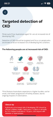 This app is a clinical guide based upon the latest evidence available at the time of publication of the CKD Management in Primary Care 5th edition, 2024, Kidney Health Australia.