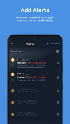 Receive notifications with the most important updates from the cryptocurrency market. Stay on top of Bitcoin price changes, the performance of your portfolio, and the biggest daily gainers and losers.