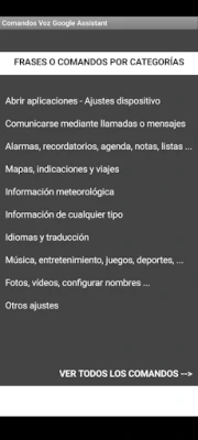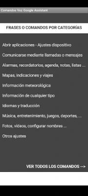 La aplicación no tiene incorporado el asistente de voz. Si tienes Ok Google activado puedes decir las palabras clave Ok Google o Hey Google y a continuación el comando o frase de la lista o bien puedes tocar el micro y después pronunciar solo la frase. Las frases están organizadas por categorías.