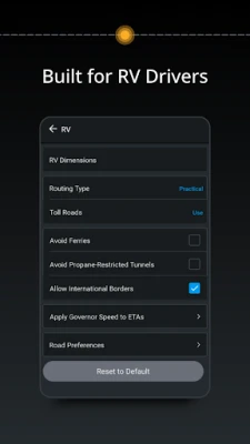 • Routes and directions designed for RVs based on your vehicle size