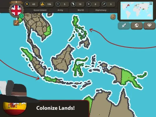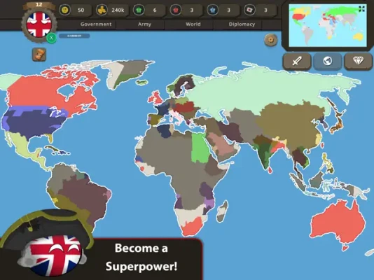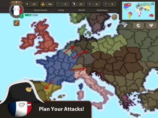 Declare war or form alliances with other nations. Sign peace treaties, send alliance requests, and even puppet weakened countries to expand your influence. Choose your allies wisely – rivals will attempt to capture your territories and defeat your nation!