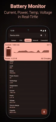 🔋 Battery: Monitor your battery's health, level, status, power source, technology, temperature, voltage, power (watts), current (mA), and capacity in real time.