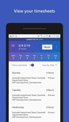The Microsoft Dynamics 365 Project Timesheet mobile app enables users to submit and approve timesheet for projects. This mobile app surfaces the timesheet functionality that resides in the project management and accounting area of Dynamics 365 for Finance and Operations, improving user productivity and efficiency as well as enabling timely entry and approval of project timesheets.