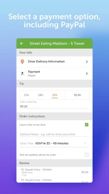The EatStreet Android app supports a variety of payment methods for food delivery or pickup. We accept credit cards and PayPal! EatStreet food ordering app lets you split the bill for group meal deliveries.