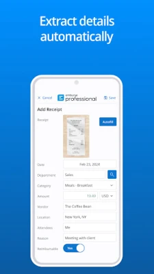 Experience effortless expense management with the Emburse Professional app (formerly Certify Mobile). Simply capture each receipt with your smartphone and Emburse will accurately extract receipt data, using AI to automatically fill out and categorize expense entries. Employees can then easily create, submit, and approve expense reports on-the-go from the app.