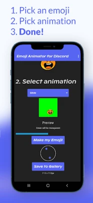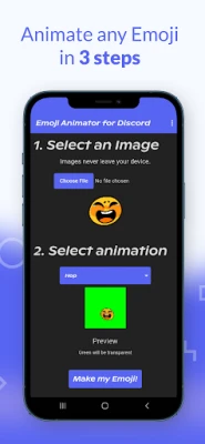 The app will make an animated emoji and generate a moving GIF image that you can save to your gallery and use on discord or any other platform like Twitch. The app works completely offline too!