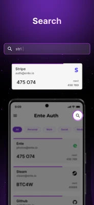Ente Auth allows you to find your 2FA codes through one tap search. No more scrolling through a long list to find the right codes. Just tap on search and start typing.