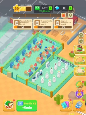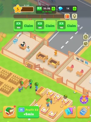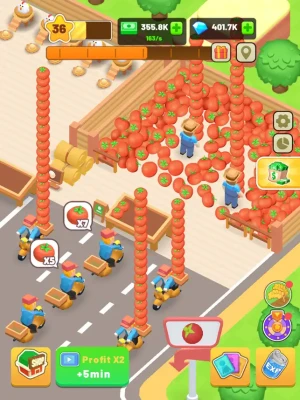 Click, tap, and upgrade your buildings to earn cash. Hire workers to help manage your business. Tend your farmer's team and sell your goods to the farmer's market for profit!