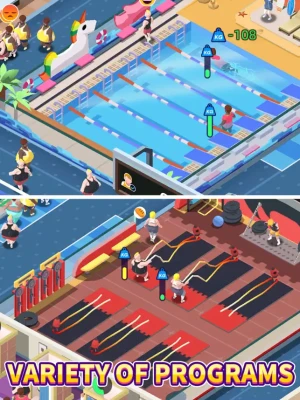 There are treadmills, battle ropes, swimming, calisthenics, boxing and a wealth of other sports, each with a unique and interesting visual animations. Watch the guests working out hard in each gym and feel the fat burning!! You'll even move along with the poses of the customers to the upbeat music!
