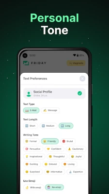 Whether you want to write to your partner, friend, or colleague, get advice, or find new connections, Friday has it covered. Whether you're a student, a professional, or someone who wants to improve their writing, Friday is here to help.