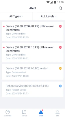 The device administrators can work on mobile devices by scanning the codes to add devices, configure accounts/upgrade devices firmware quickly, and the alert messages can be pushed to mobile client. Including: 1. Scan code to add device: Support to scan the barcodes of a batch of devices to add the devices to GDMS platform. 2. Manage device: Support to configure accounts for devices, upgrade devices firmware, and start the devices remotely. 3. Monitor device in real-time: Push the device registration, abnormal status, alert messages to mobile management client