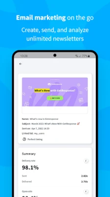 Our mobile app is your on-the-go source full of all the information you need to run and manage all your online marketing in GetResponse. Get access to detailed analytics on your campaigns’ performance, send emails, collect leads, make sales, and grow your business — from anywhere you want, at any time!