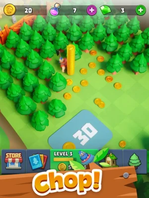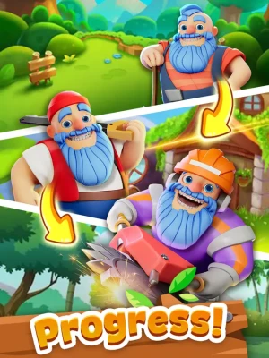 Collect gold to hire more lumberjacks! Merge them together and increase their power and efficiency. Break through difficult obstacles to collect Gold, Gems, and Energy and complete more levels.