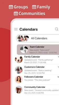 Shared calendar and evens for groups and teams. Plan, schedule, manage and organize time for work, family, projects and tasks.