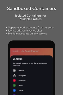 Hermit is the only Android browser with Sandboxes: Isolated Containers with Multiple Profiles.