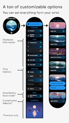 Horizon is a miniature animated world on your smartwatch, where every second of the day has its distinct representation. Over 280 different theme and colour palette combinations are available.