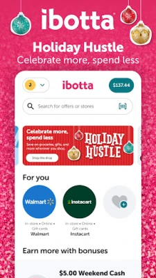 Earning cash back has never been easier. Ibotta has hundreds of offers on everything you need, from everyday items to groceries. Download the free app now to start saving. Offers come out on Mondays and are available for a limited time and in limited quantities only. See offer details. Ibotta reserves the right to modify or terminate the Holiday Hustle program at any time in its sole discretion. Qualifying products and MSRPs may vary. Redemption must be made within 7 days of purchase. Subject to full Ibotta Terms of Use, available at https://legal.ibotta.com/.